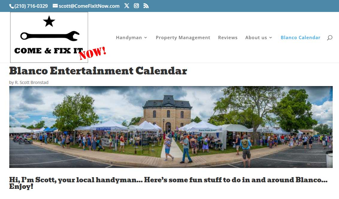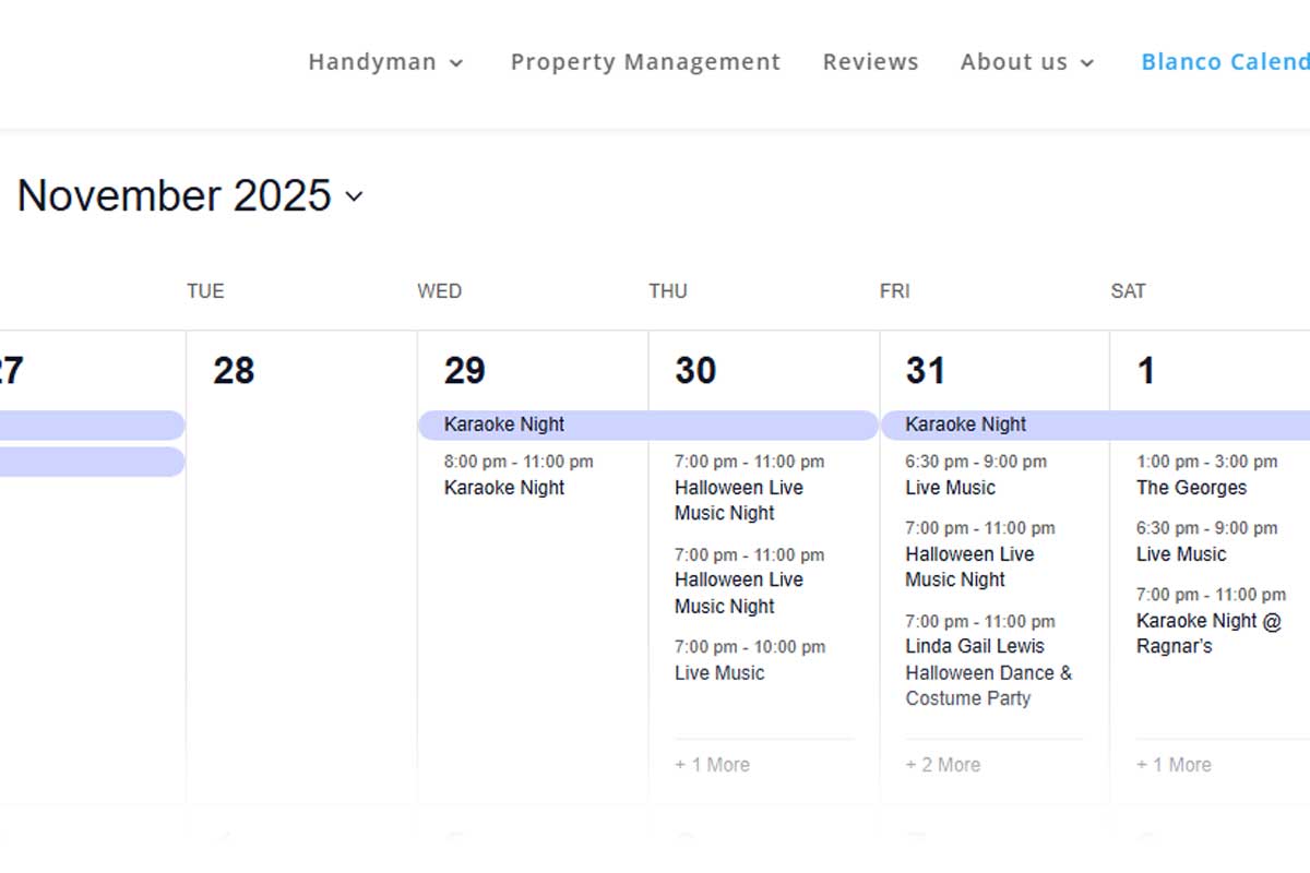 - The Result: The events instantly populate the Blanco Entertainment Calendar page on my site, which is located here. The whole process, once set up, takes me maybe a total of fifteen focused minutes each month.