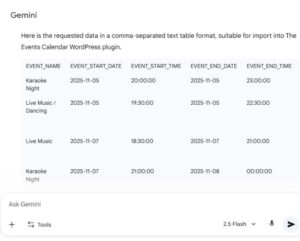 - The Scrape: My Gemini Gem scrapes the event information directly from the local restaurant and bar websites. It’s looking for keywords like “Karaoke,” “Live Music,” and “Dancing.” The Gem is smart enough to handle different website structures and pull the relevant data points: date, time, venue, and event description.